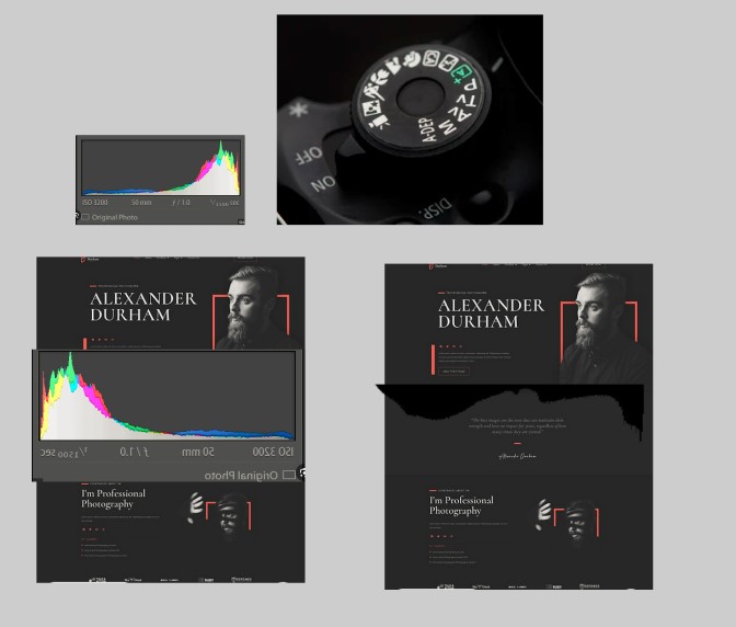 I then did a brainstorming session, where I started with the keyword photography, and made some associations with it. By that I got the histogram, camera wheel and lens elements, that I wanted to somehow include on the website.